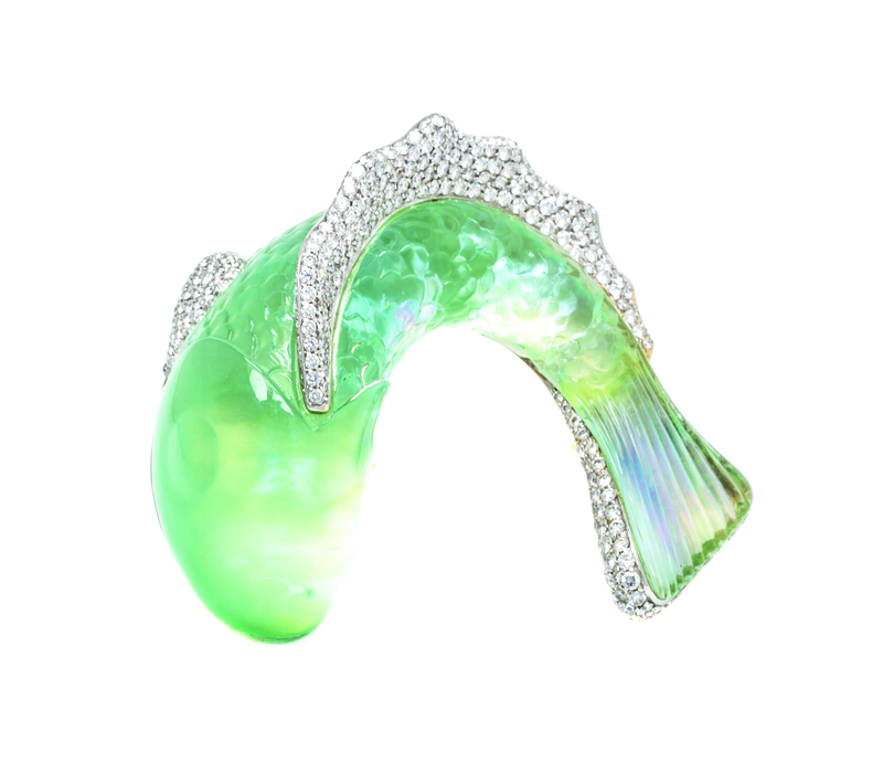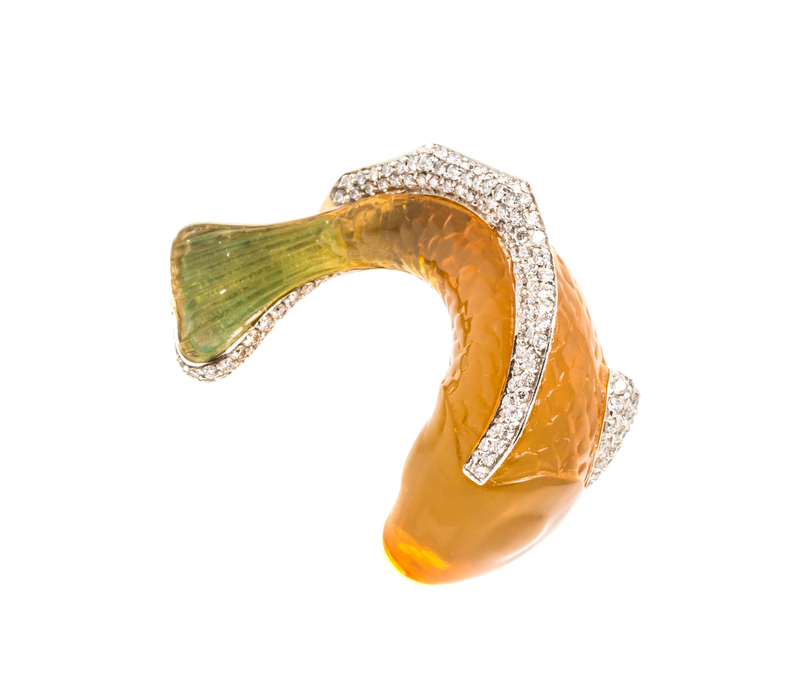 consisting of a fish motif brooch composed of a carved rock crystal section set above a laminate of mother-of-pearl and green hardstone against a yellow gold base and accented with white gold fins pave set with numerous round brilliant cut diamonds weighing approximately 2.75 carats total, together with a similar brooch composed of a carved fire opal set against a yellow gold base, backed at the tail fin with emerald, and accented with white gold fins containing numerous round brilliant cut diamonds weighing approximately 0.75 carat total.