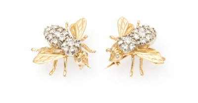 A Pair of 14 Karat Yellow Gold and Diamond Bee Brooches,