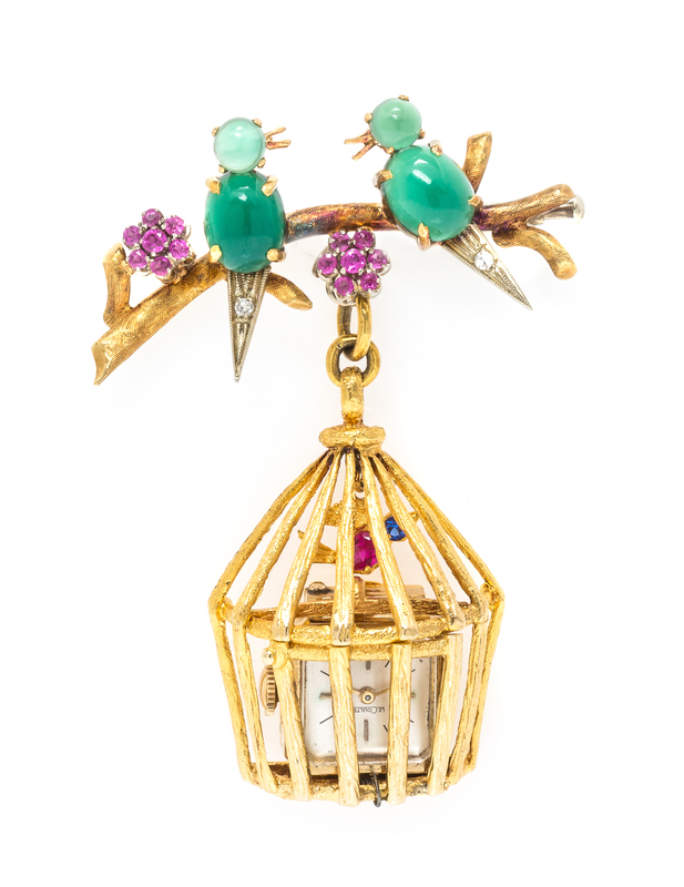 consisting of a textured openwork cage motif pendant enclosing an articulated synthetic gem set bird accent and a square cased watch signed LeCoultre, white dial, applied and painted baton numerals, gilt baton hands, snap on case back, manual wind mechanical movement, cage pendant is suspended from a textured gold branch motif brooch accented with floral accents set with 14 round mixed cut pink sapphires and two perched birds containing four cabochon cut dyed green chalcedony and two round single cut diamond accents. Stamp: 14K 18K ITALY.