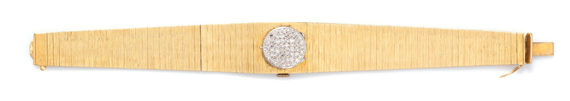 the hinged cover containing numerous single cut diamonds weighing approximately 0.56 carat total, matte silvered dial signed Desky, applied index and Arabic numerals, gilt feuille hands, snap on case back, manual wind 17 jewel mechanical movement, bark texture bracelet. Clasp stamp: 18K Italy.Caseback stamp: 14kt gold.