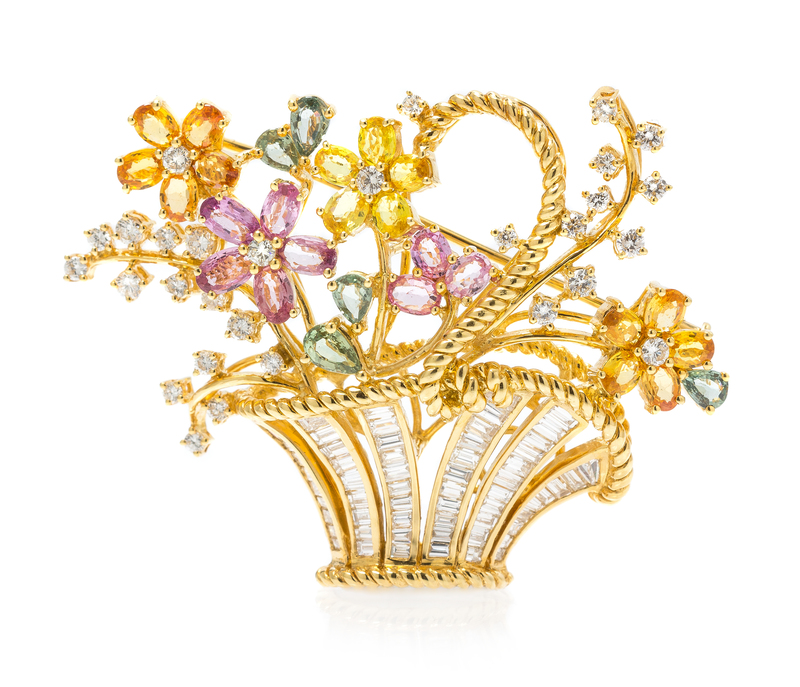 An 18 Karat Yellow Gold, Multi-Colored Sapphire and Diamond Flower Basket Brooch,