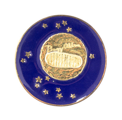 marked number 422 of limited series, front has a central textured lunar depiction with miniature footprint signed Buzz Aldrin, surrounded by blue enamel star speckled high polish border, the back engraved: "A GIANT STRIDE FOR MANKIND..." IILLINOIS MASONIC MEDICAL CENTER Commemorating the W. CLEMENT STONE PAVILLION and the FIRST MOON LANDING 1969. 422.Stamp: TIFFANY & CO. 14K.