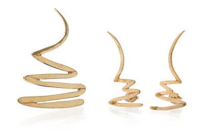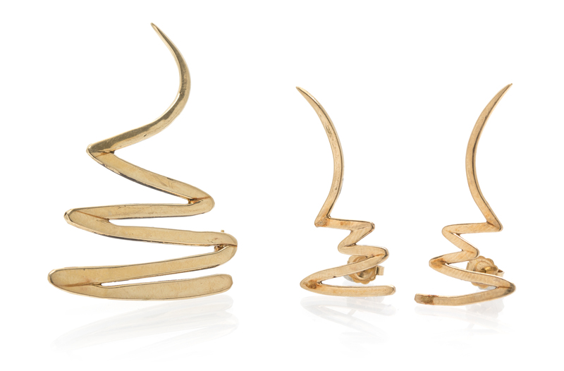 consisting of a pair of earrings and brooch in a stylized zig zag motif. Earring stamp: 14K.