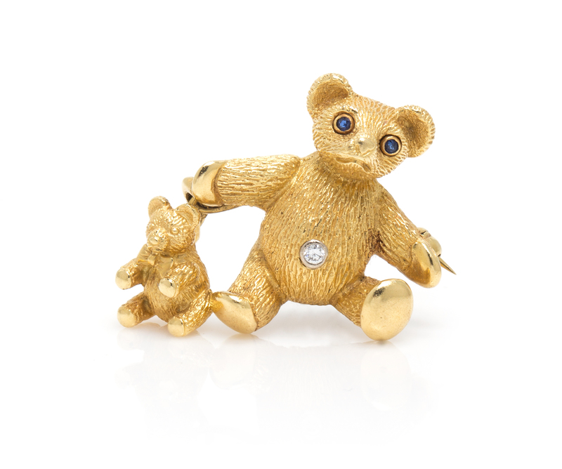 An 18 Karat Yellow Gold, Sapphire and Diamond Teddy Bear and Bear Charm Brooch, Tiffany & Co., Circa 1989,