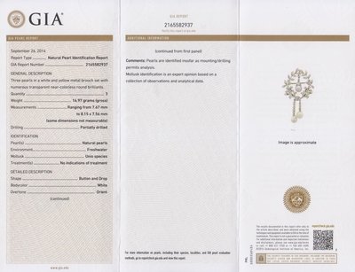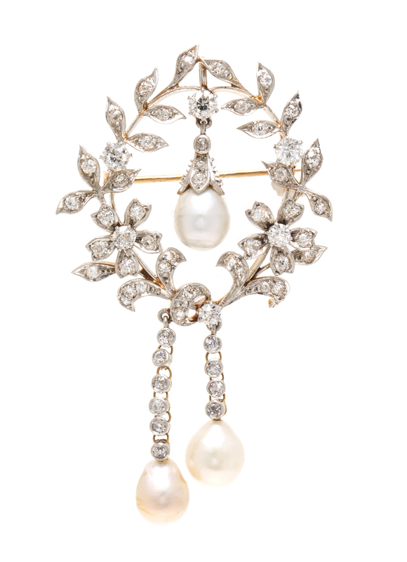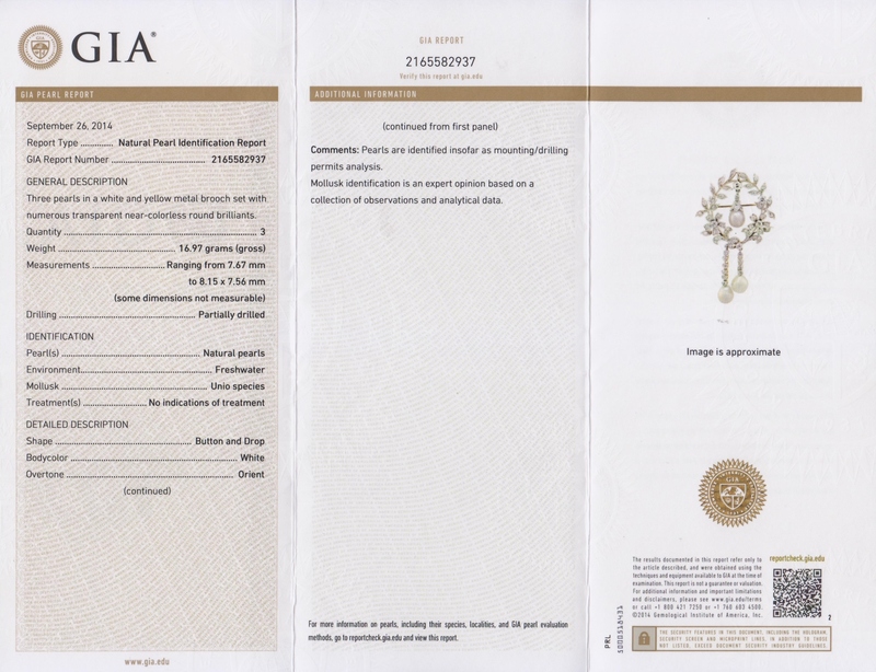 in a foliate garland motif containing 44 old European cut diamonds weighing approximately 1.51 carats total and five old European cut diamonds weighing approximately 0.79 carat total, the central pendant composed of a gold backed button shape pearl measuring approximately 7.67 mm in diameter, the garland suspending two drop pendants containing 10 bezel set old European cut diamonds weighing approximately 0.29 carat total and two natural drop shape pearls measuring approximately 8.15 x 7.56 mm, gold brooch fittings and suspension hoop allowing wear as pendant. Hand inscribed: 793.Accompanied by a Gemological Institute of America pearl identification certificate number 2165582937, dated September 26, 2014, stating Pearls: Natural, Environment: Freshwater, Mollusk: Unio species, Treatments: No indications of treatment, Shape: Button and Drop, Bodycolor: White.