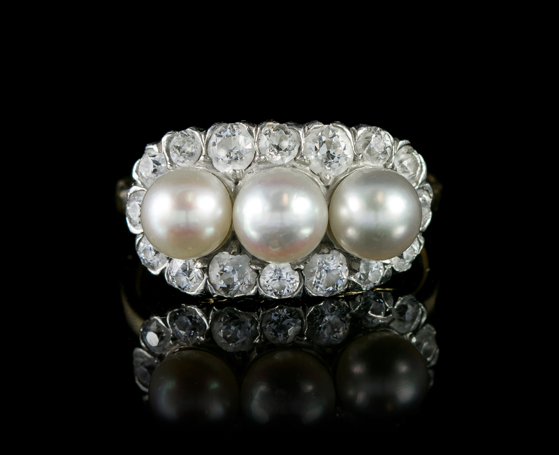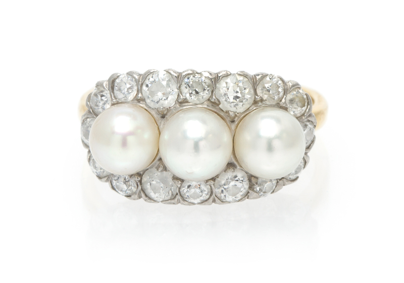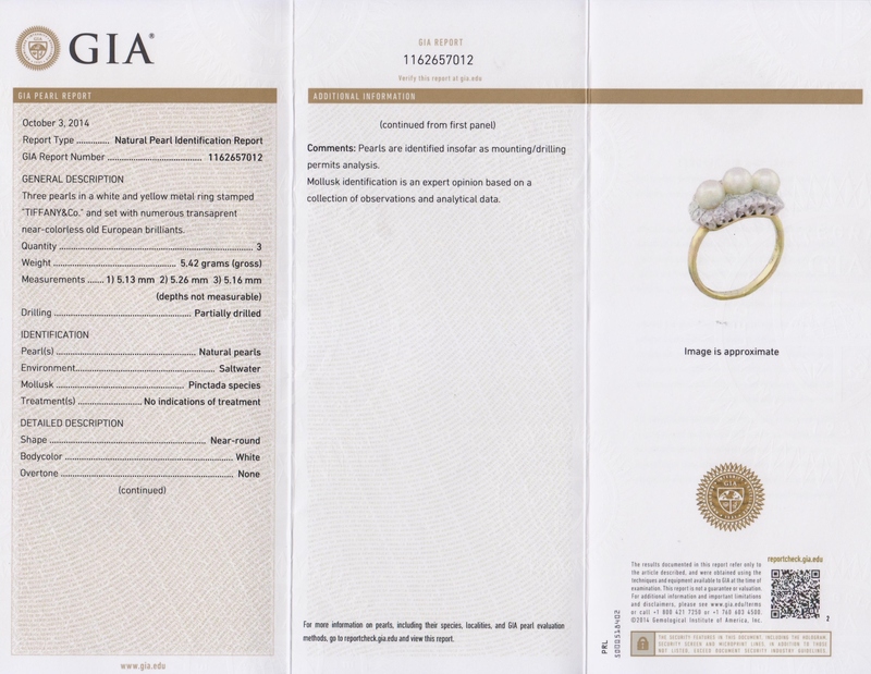 containing three natural pearls measuring approximately 5.13-5.26 mm in diameter and 16 old European cut diamonds weighing approximately 0.85 carat total.Stamp: TIFFANY & CO.Accompanied by a Gemological Institute of America pearl identification certificate number 1162657012, dated October 3, 2014, stating Pearls: Natural, Environment: Saltwater, Species: Pinctada, Treatments: No indications of treatment, Shape: Near Round, Bodycolor: White.