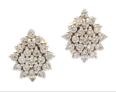 A Pair of 14 Karat Yellow Gold and Diamond Cluster Earrings,