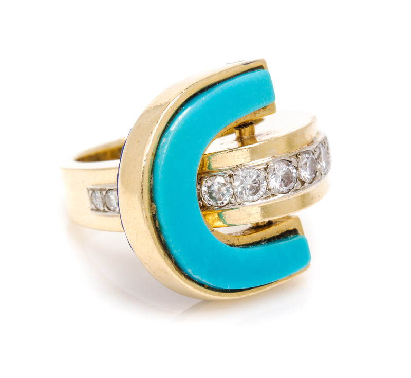 in a domed design containing 15 round brilliant cut diamonds weighing approximately 0.65 carat total, accented with a hinged articulated U shape element containing inset lapis lazuli and turquoise.