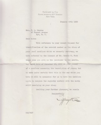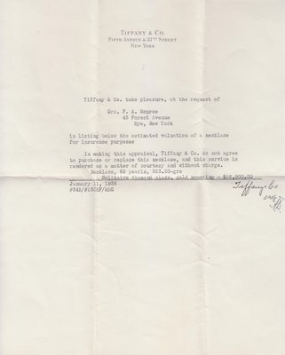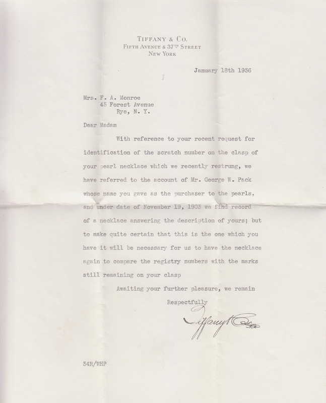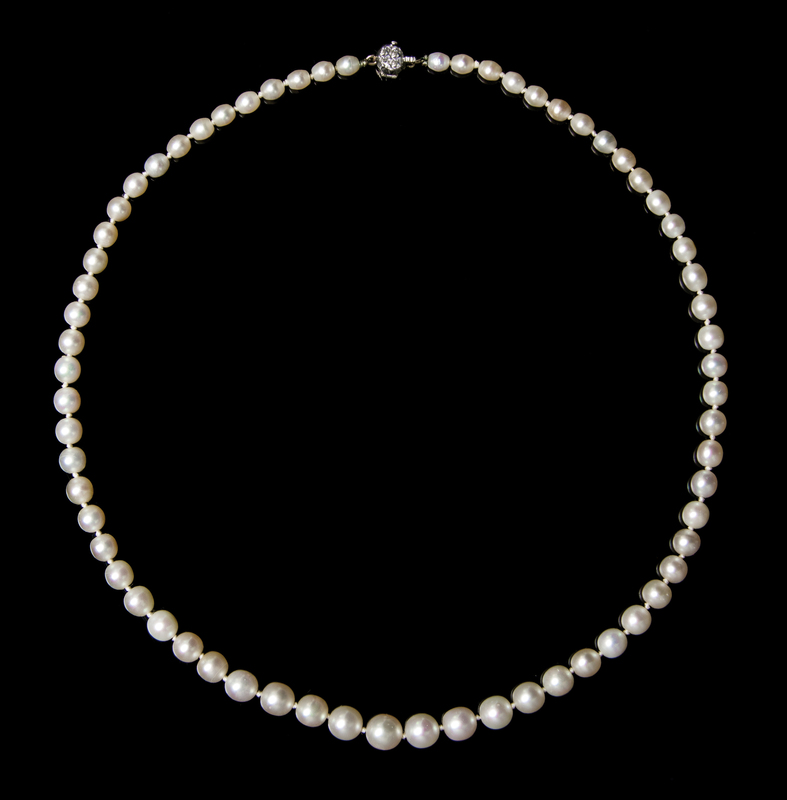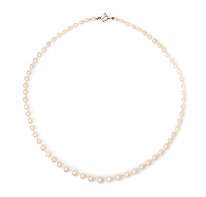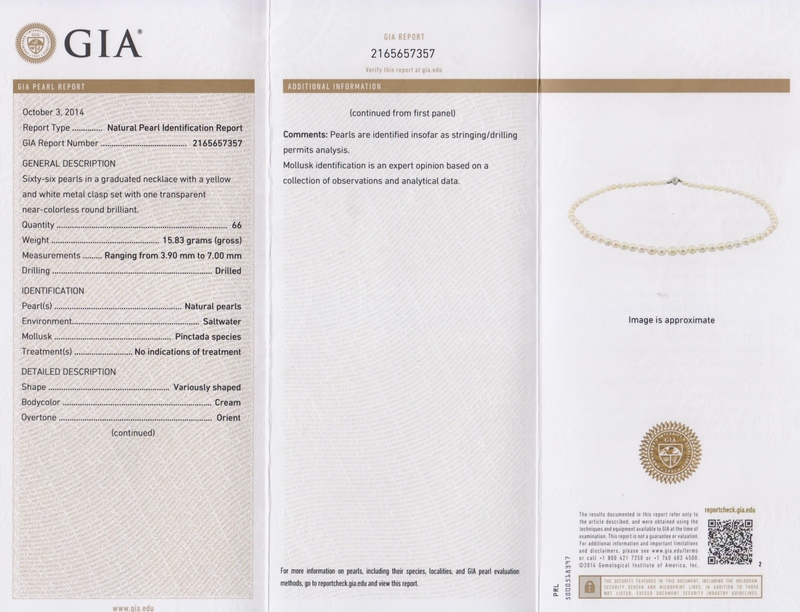 consisting of 66 graduated pearls measuring approximately 3.90-7.00 mm strung knotted with a platinum topped gold clasp containing one old European cut diamond weighing approximately 0.48 carat total.Accompanied by a Gemological Institute of America pearl identification certificate number 2165657357, dated October 3, 2014, stating Pearls: Predominantly Natural, Environment: Saltwater, Species Pinctada, Treatment: No indications of treatment, Shape: Variously, Bodycolor: Cream, Overtone: Orient.Accompanied by the original case signed TIFFANY & Co. NEW YORK PARIS LONDON.Accompanied by an envelope and appraisal dated to 1936, as well as an additional letter from 1936 describing the original purchase by George Willis Pack of the necklace in 1903, all signed by TIFFANY & Co.