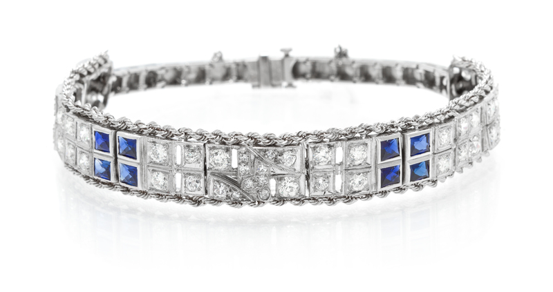 composed of a central two row platinum section bordered with white gold rope texture accents extending to the hand engraved single row platinum base, containing 44 old European and eight single cut diamonds weighing approximately 4.00 carats total and eight French cut synthetic sapphires.Stamp: PLATIN IRID10 (partially obscured).