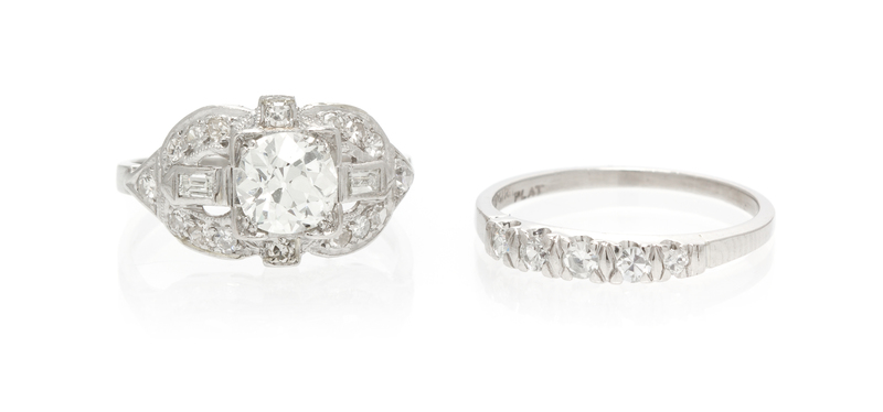 consisting of a ring containing one old European cut diamond weighing approximately 0.90 carat, two straight baguette cut diamonds weighing approximately 0.08 carat total, and 21 round single cut diamonds weighing approximately 0.34 carat total, together with a platinum band containing five single cut diamonds.Stamp: CC&G .900PLAT.100 IRID.