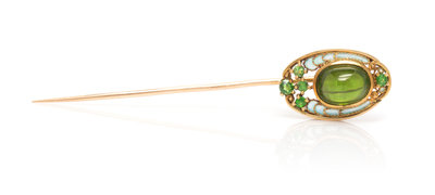 An Art Nouveau Yellow Gold, Peridot, Demantoid Garnet and Plique-a-Jour Enamel Stick Pin, Louis Comfort Tiffany for Tiffany & Co.,