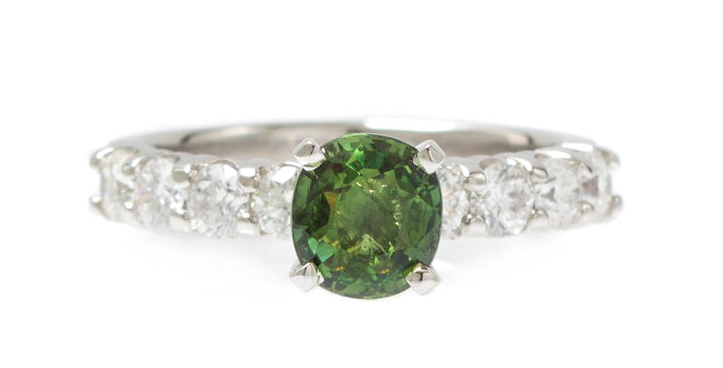 containing one cushion shape mixed cut green sapphire weighing approximately 1.67 carats and eight round brilliant cut diamonds weighing approximately 0.80 carat total.Stamp: PT950.