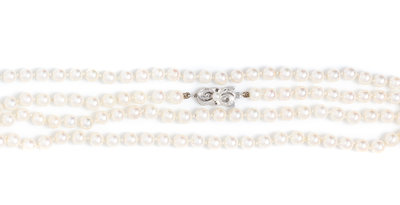 consisting of numerous pearls measuring approximately 5.60-5.75 mm in diameter strung knotted with an openwork silver clasp accented with a single pearl measuring approximately 3.80 mm.Stamp: SIL (maker's M for Mikimoto).Accompanied by the original case and guarantee papers signed MIKIMOTO.