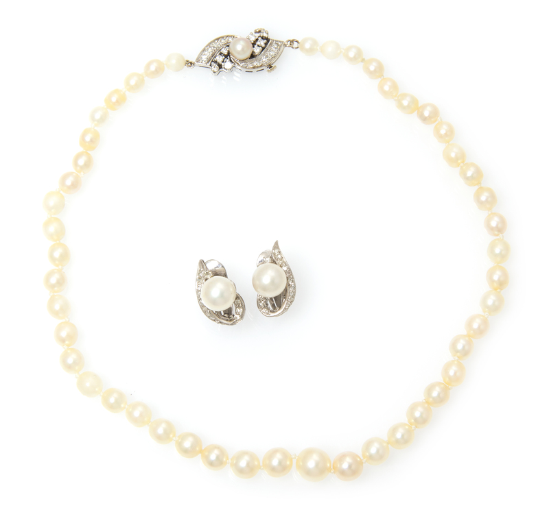consisting of a pair of 18 karat white gold earclips containing two pearls measuring approximately 8.32-8.37 mm in diameter and 28 single cut diamonds weighing approximately 0.33 carat total together with a single strand of cultured pearl necklace containing 47 pearls measuring approximately 4.84-8.31 mm in diameter strung knotted with an 14 karat white gold clasp containing 20 single cut diamonds weighing approximately 0.26 carat total and one cultured pearl measuring approximately 5.56 mm in diameter.Clasp stamp: 14K.Earring stamp: 18K.