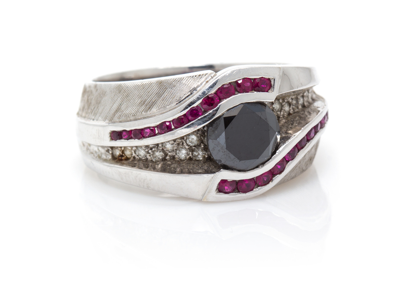 A 14 Karat White Gold, Black Diamond, Diamond and Ruby Ring,
