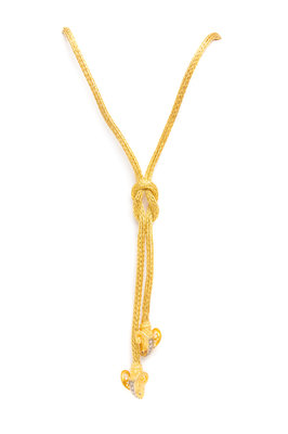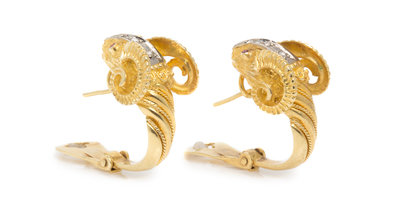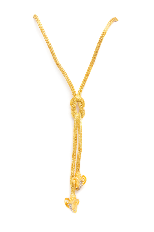consisting of a meshwork chain with a central knotted design extending to the intricately engraved and textured gold ram's head pendants containing ten round brilliant cut diamonds weighing approximately 0.20 carat total and four round cut rubies, together with a pair of ram's head earclips containing six round brilliant cut diamonds weighing approximately 0.06 carat total and four round cut rubies accenting the eyes. Stamp: 750.