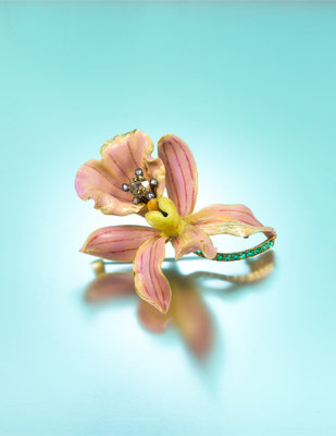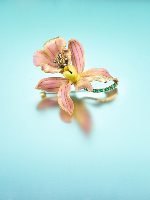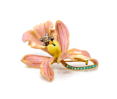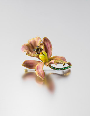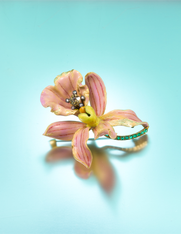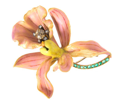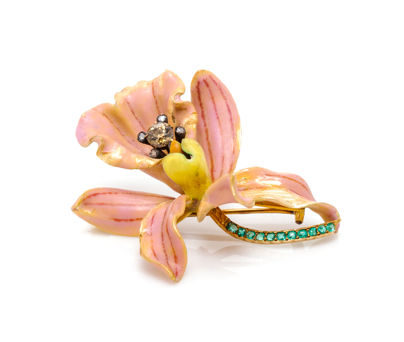 in an intricate naturalistic design, the curled petals of the yellow gold blossom accented front and reverse with pink, purple, yellow and orange enamel accurately mimicking the subtle coloration and veining of the orchid, the center of blossom accented with a silver wirework stamen containing an old mine cut brown diamond measuring approximately 4.60 mm in diameter within a five point surround, each containing a rose cut diamond, the curved gold stem containing 11 round and oval mixed cut emeralds, the brooch measures approximately 49.00 x 43.00 mm.Stamp: TIFFANY & CO.For a very similar example of this design see Paulding Farnham: Tiffany's Lost Genius, John Loring, pg. 56.