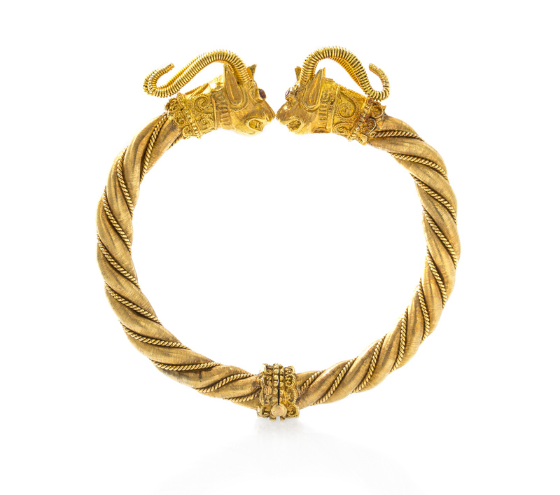 consisting of a flexible spring-hinged matte finish twisted rope motif bangle with beaded wire accents terminating in two stylized rams head finials with inset ruby eyes together with cannetille and beaded detail.Stamp: (Maker's mark S and Z to the left and right of a flared cross) K18 GREECE.