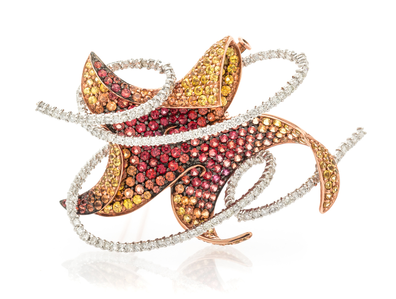 in a stylized starfish motif, the rose gold star containing numerous pave set round mixed cut yellow, orange and orange red sapphires weighing approximately 7.80 carats total accented with white gold wirework containing numerous round brilliant cut diamonds weighing approximately 2.40 carats total.