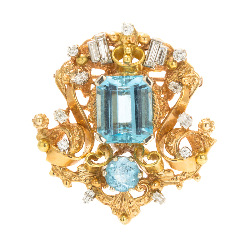 in an openwork design with scrolled accents, containing one octagonal step cut aquamarine measuring approximately 13.71 x 11.31 x 7.50 mm, one round mixed cut aquamarine measuring approximately 7.11-7.19 x 4.86 mm, 10 straight baguette cut diamonds weighing approximately 0.76 carat total and five round brilliant cut diamonds weighing approximately 0.21 carat total.