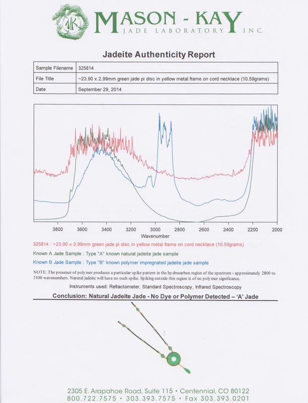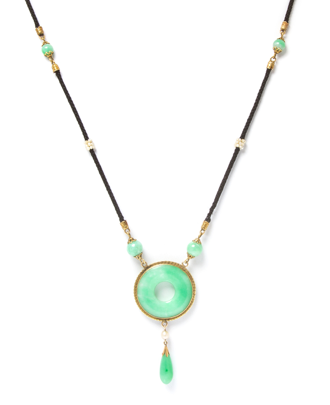 consisting pendant containing a bezel set jade bi measuring approximately 24.00 mm in diameter, a polished jade briolette measuring approximately 15.40 mm in length and seed pearl measuring approximately 3.41 mm in diameter, suspended from a woven black cord containing four round jade beads measuring approximately 5.30-6.80 mm in diameter, two stations of spiral woven seed pearls and hand engraved endcaps.Accompanied by a Mason Kay jade identification certificate number 325814, dated September 29, 2014, stating Conclusion: Natural Jadeite Jade, Enhancement: No dye or polymer detected, "A" Jade.