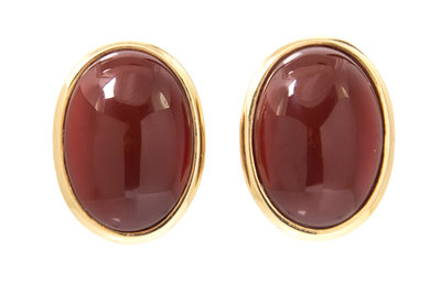 containing two oval cabochon cut carnelian measuring approximately 25.00 x 18.00 mm, with 14 karat yellow post and earclip backs.Stamp: IV.Clipback stamp: 585 (hallmark).