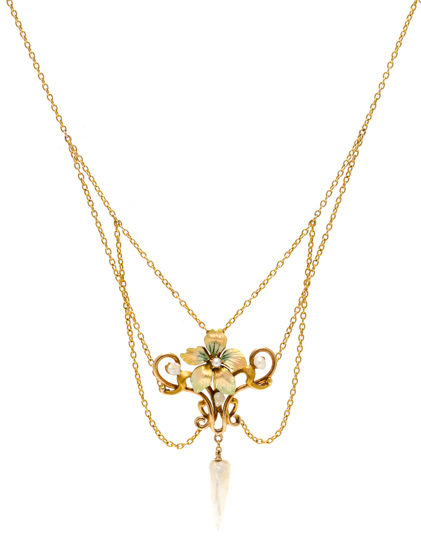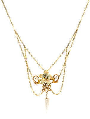 An Art Nouveau Gold, Polychrome Enamel and Pearl Necklace,