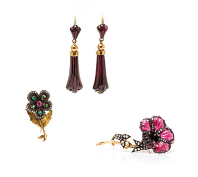 consisting of a yellow gold and blackened silver flower motif brooch containing five pear shaped emeralds, one cushion cut pink sapphire and numerous rose cut diamonds, one rose gold and blackened silver flower motif brooch with carved amethyst petals, accented with rose cut diamonds and one pair of carved amethyst pendant earrings.