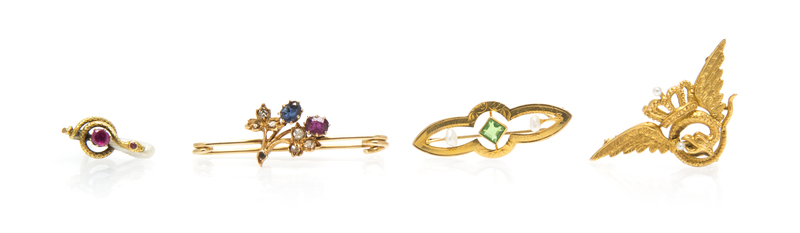consisting of a serpent pin containing two cushion cut rubies and a baroque pearl, a floral motif pin containing one cushion cut sapphire, one cushion cut ruby and seven rose cut diamonds, one 10 karat yellow gold brooch containing one square step cut green glass and two seed pearls, and one winged serpent and crown brooch containing two round seed pearls.
