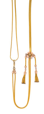 consisting of a yellow gold woven necklace with a rose gold slide, rose gold beads and woven tassels. Necklace stamp: 14K.