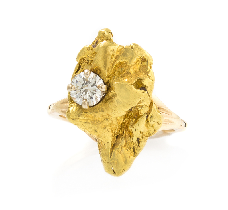 containing one round brilliant cut diamond weighing approximately 0.60 carat total surmounted on natural gold nugget, later expandable shank.