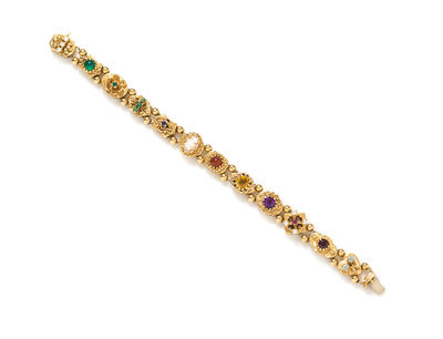 A Vintage 14 Karat Yellow Gold and Multi Gem Charm Slide Bracelet,