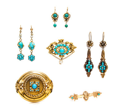 consisting of an oval brooch with a central plaque containing 13 round cabochon cut turquoise, a bar pin containing two round cabochon cut turquoise, a 14 karat yellow gold brooch containing 13 round cabochon cut turquoise and one cultured pearl drop, one pair of turquoise and seed pearl earrings, one pair of turquoise drop earrings and one pair of turquoise drop earrings.