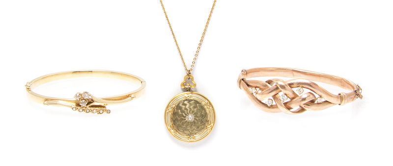 consisting of a hinged hollowform yellow gold bangle containing six round seed pearls measuring approximately 1.50-2.00 mm in diameter and three old mine cut diamonds weighing approximately 0.33 carat total, a rose gold hinged hollowform bangle in a knot motif containing five round brilliant cut diamonds weighing approximately 0.36 carat total, and a goldtone locket containing one old European cut diamond weighing approximately 0.05 carat suspended from a curb link chain.