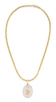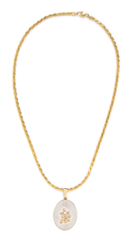 consisting of a white gold oval pendant containing one round brilliant cut diamond weighing approximately 0.11 carat suspended from a flat yellow gold rope chain.Chain stamp: 585.Pendant stamp: 14K.