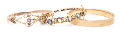 consisting of one 14 karat hollow form hinged bangle bracelet, one 9 karat rose gold hollow form bangle bracelet containing three round cut amethysts and 11 seed pearls and one yellow gold bangle containing six oval cabochon cut opals.