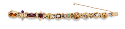 consisting of 11 charms of various shapes and motifs containing pearl, diamond, sapphire, coral, amethyst, turquoise, onyx cameo, emerald, and citrine. Stamp: 14K.
