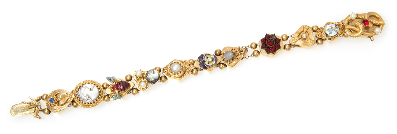 A Vintage 14 Karat Yellow Gold, Enamel and Multi Gem Charm Slide Bracelet,