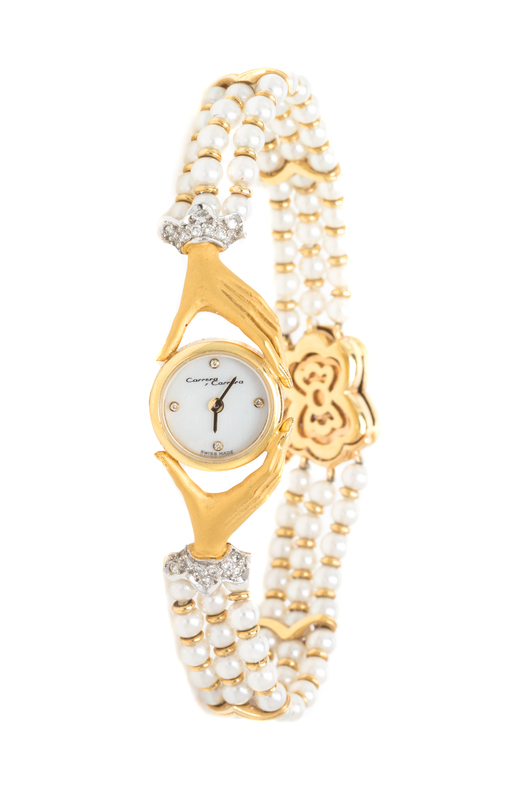 12.00 mm case diameter, mother-of-pearl dial signed CARRERA y CARRERA, diamond numerals, gilt baton hands, quartz movement, snap on case back, triple strand pearl bracelet.Clasp stamp: 750 (makers mark for Carrera y Carrera).Case back stamp: 311 31407 108 (makers mark for Carrera y Carrera). Accompanied by a signed inner and outer box.