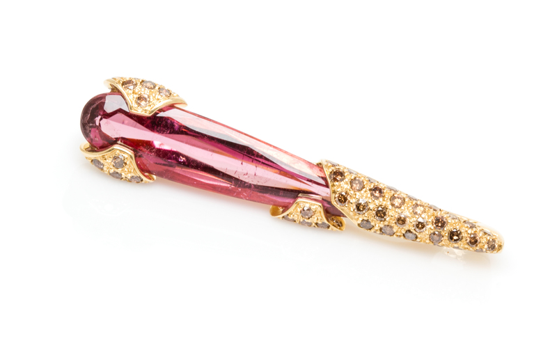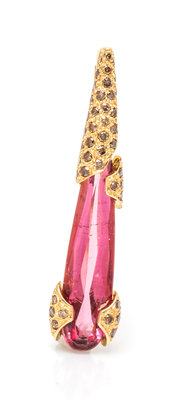 containing a pear shape pink cuprian tourmaline weighing approximately 5.78 carats set within a partial wrap setting containing 57 round brilliant cut brown diamonds (origin of color not tested) weighing approximately 0.75 carats.Stamp: 750 (WINC).NOTE: The present lot features a cuprian, or copper, bearing elbaite tourmaline from Mozambique. This type of tourmaline is known as Paraiba-type for its better known electric blue and green hues created through heat treatment of natural occurring colors such as the stone in this pendant.