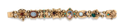 consisting of eight charms of various shapes and designs containing a portrait miniatures, seed pearls, garnet, moonstone, turquoise, opal, sapphire, glass and dyed green chalcedony. Stamp: 14K.
