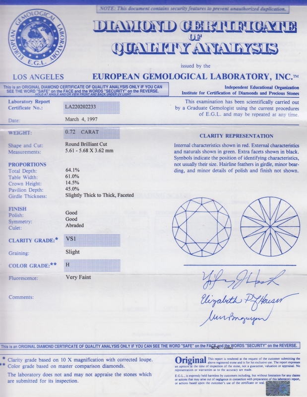 containing one round brilliant cut diamond weighing approximately 0.72 carat.Accompanied by a European Gemological Laboratory Los Angeles diamond grading certificate number LA220202233, dated March 4, 1997, stating Weight: 0.72 carat, Color: H, Clarity: VS1, Table: 61.0%, Depth: 64.10%, Polish: Good, Symmetry: Good, Fluorescence: Very Faint.