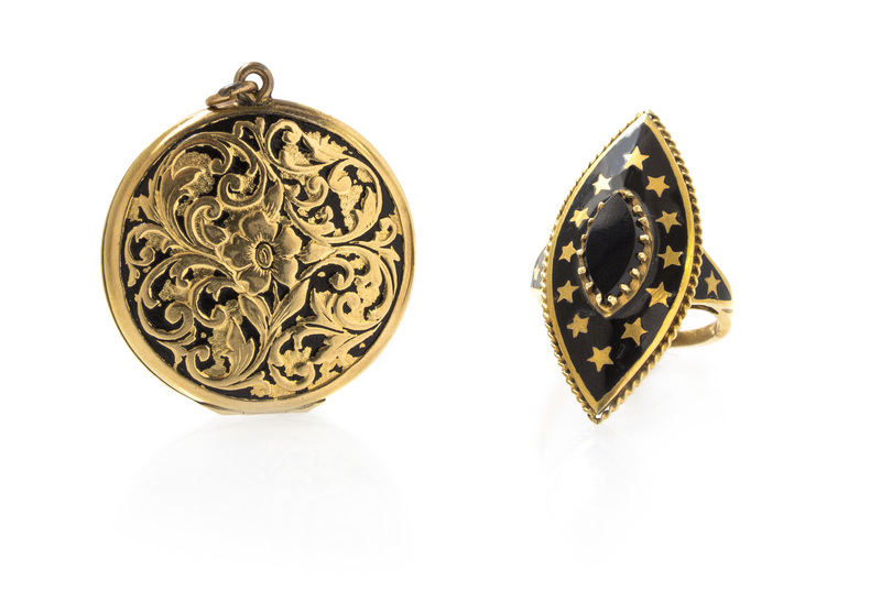consisting of a 14 karat gold locket measuring approximately 30.00 mm in diameter with a floral design and black enamel inlay, together with a lozenge shape ring with black enamel accents, gold star accents and surmounted with one marquise shape buff top black onyx.Locket stamp: 14K.