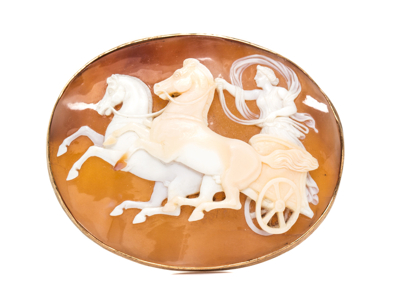 containing an oval cameo depicting a two horse biga chariot carrying a woman, cameo measures approximately 65.00 x 53.00 mm and is set within a gold bezel setting.