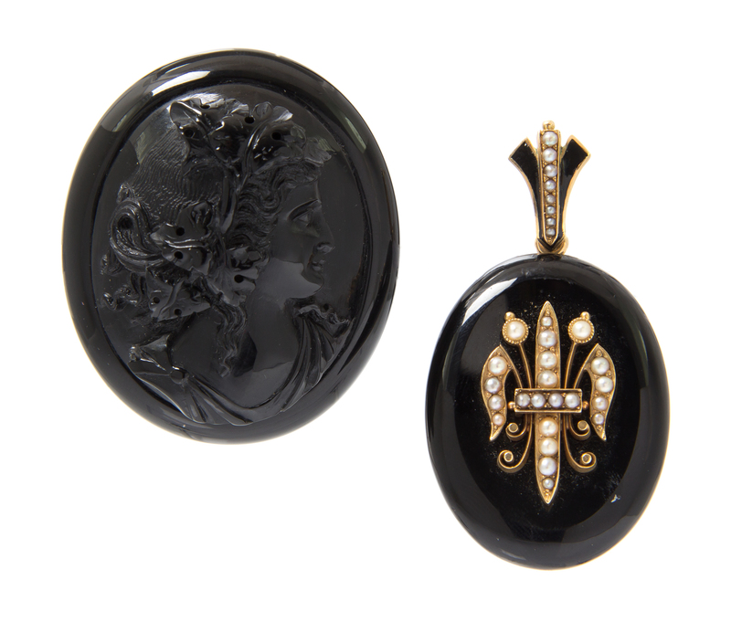 of oval form, consisting of an onyx pendant surmounted with a fleur-de-lys motif containing numerous split pearls, the reverse with glazed compartment, the pendant suspended from a flared bail accented with black enamel and numerous graduated seed pearls, together with a black cameo brooch of unknown material depicting a woman with flowing hair.