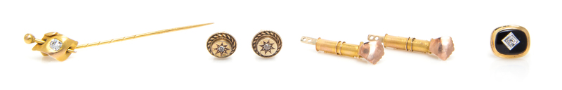 consisting of one pair of Victorian style yellow gold ear pendants, a pair of 15 karat gold earrings containing two old mine cut diamonds, one 14 karat tie tack containing a buff top cabochon cut onyx and one round brilliant cut diamond weighing approximately 0.08 carat and a stick pin containing one antique cushion cut diamond weighing approximately 0.24 carat.
