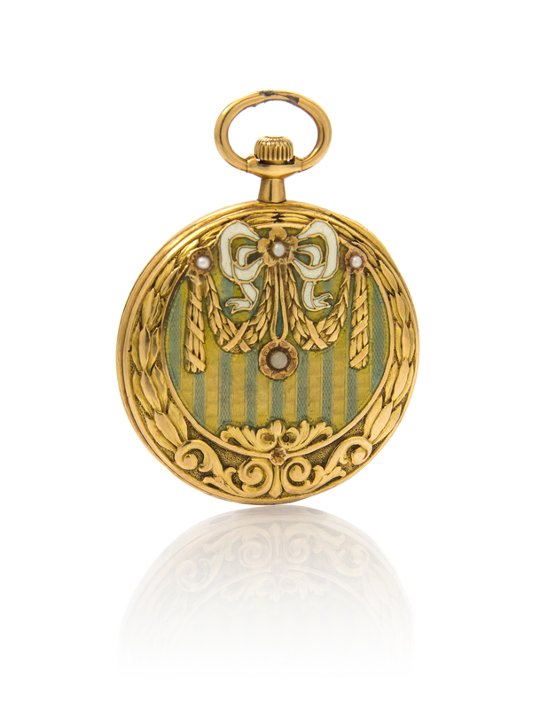 27.00 mm case diameter, matte gilt dial with central guilloche section, subdial for seconds at 6 o'clock, blued steel moon hands, Arabic numerals, the reverse depicting a bow and foliate motif garland against a vertical striped ground accented with opaque white and translucent yellow and green enamel over engraved gold, accented with four seed pearls, 17 jewel stem wound and set movement.