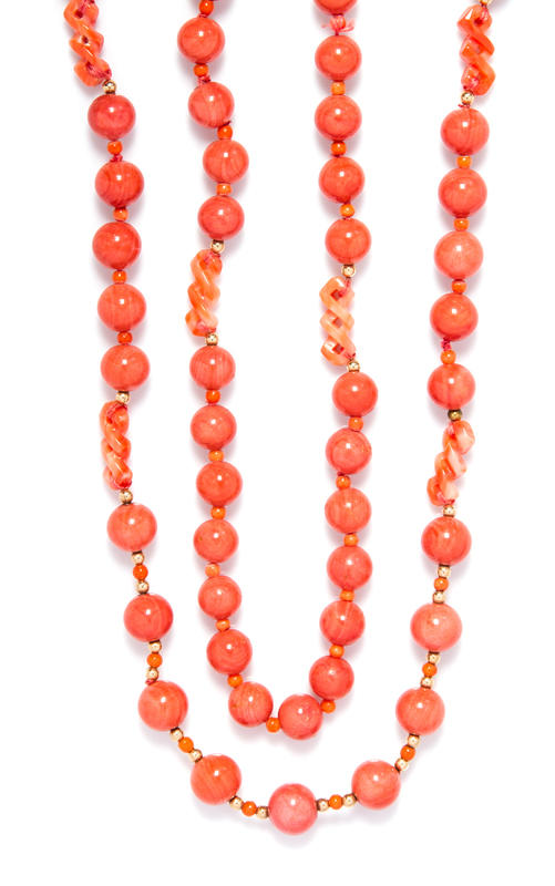 containing 53 round coral beads measuring approximately 10.18-10.78 mm in diameter, eight carved coral knot motif beads, numerous round coral beads measuring approximately 3.39-3.45 mm in diameter and numerous gold tone beads, strung in a endless style.