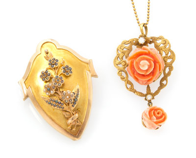 consisting of a shield shape pendant/brooch containing numerous round seed pearls in a floral pattern with glazed compartment on the reverse together with a pendant containing two carved floral motif pink coral and two old European cut diamonds weighing approximately 0.18 carat total, suspended from a ball chain.